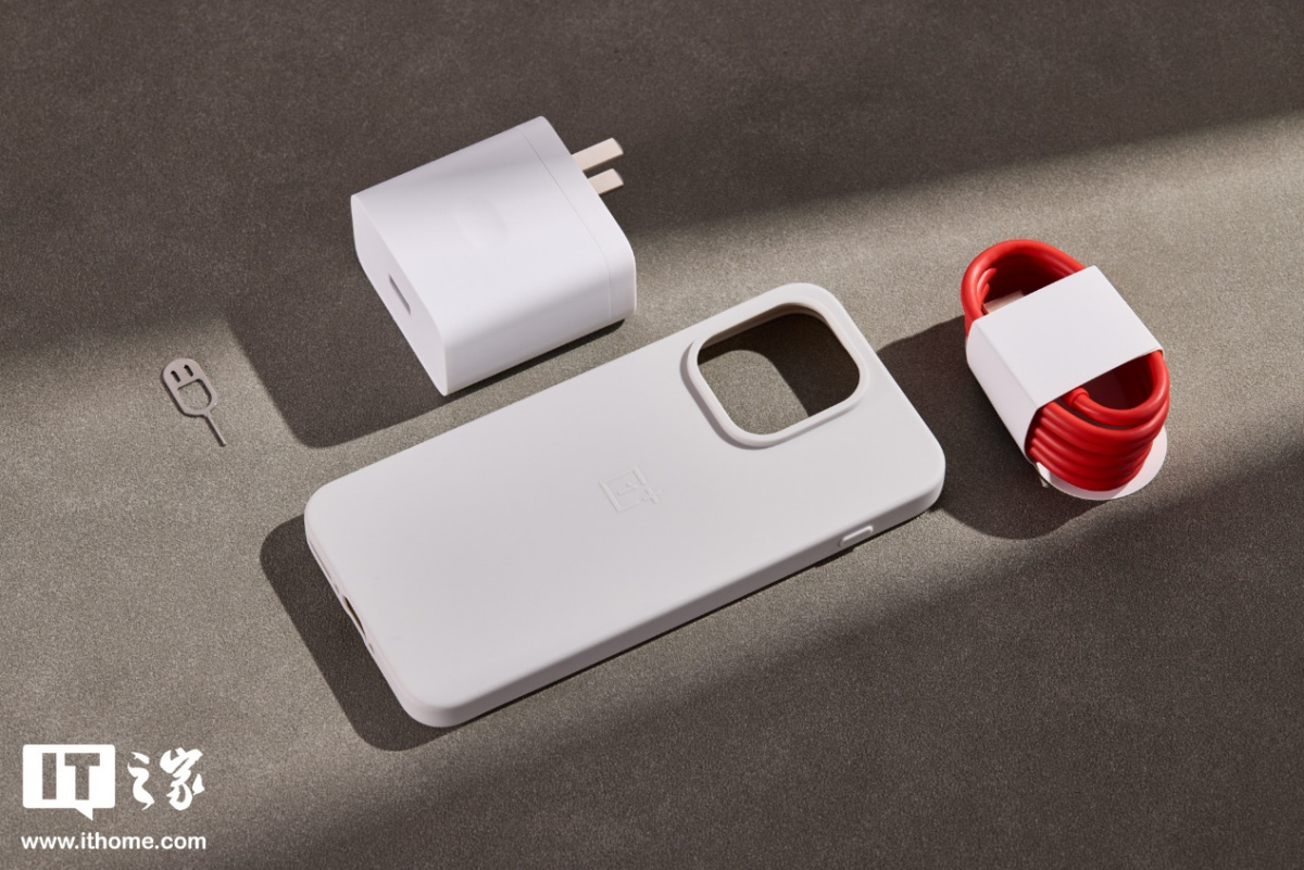 配件上,一加 15T 包装中附有白色的 100W SUPERVOOC 闪充适配器,经典红白数据线,笑脸卡针以及同色系硅胶保护软壳。